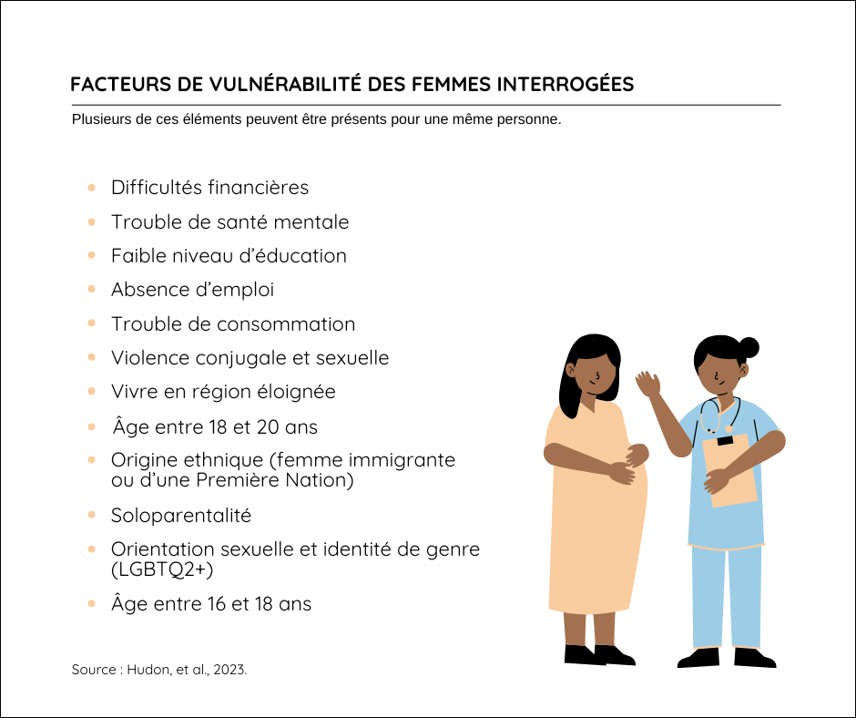 Une équipe de recherche de l’Université du Québec à Chicoutimi, de l’Université de Montréal et de l’Université de Sherbrooke s’intéresse à l’expérience des soins prénataux que font les Québécoises en situation de vulnérabilité. L’objectif? Décrire les facteurs qui influent sur la façon dont ces femmes vivent les soins. Pour ce faire, elle interroge 24 femmes âgées entre 16 et 38 ans qui reçoivent des soins prénataux par le biais du programme Œufs, lait, orange (Olo) ou celui des Services intégrés en périnatalité et pour la petite enfance (SIPPE). Pour la moitié d’entre elles, il s’agit d’une première grossesse. Alors que 10 femmes sont enceintes au moment des entretiens, 14 autres ont donné naissance dans les 12 mois précédant l’étude.